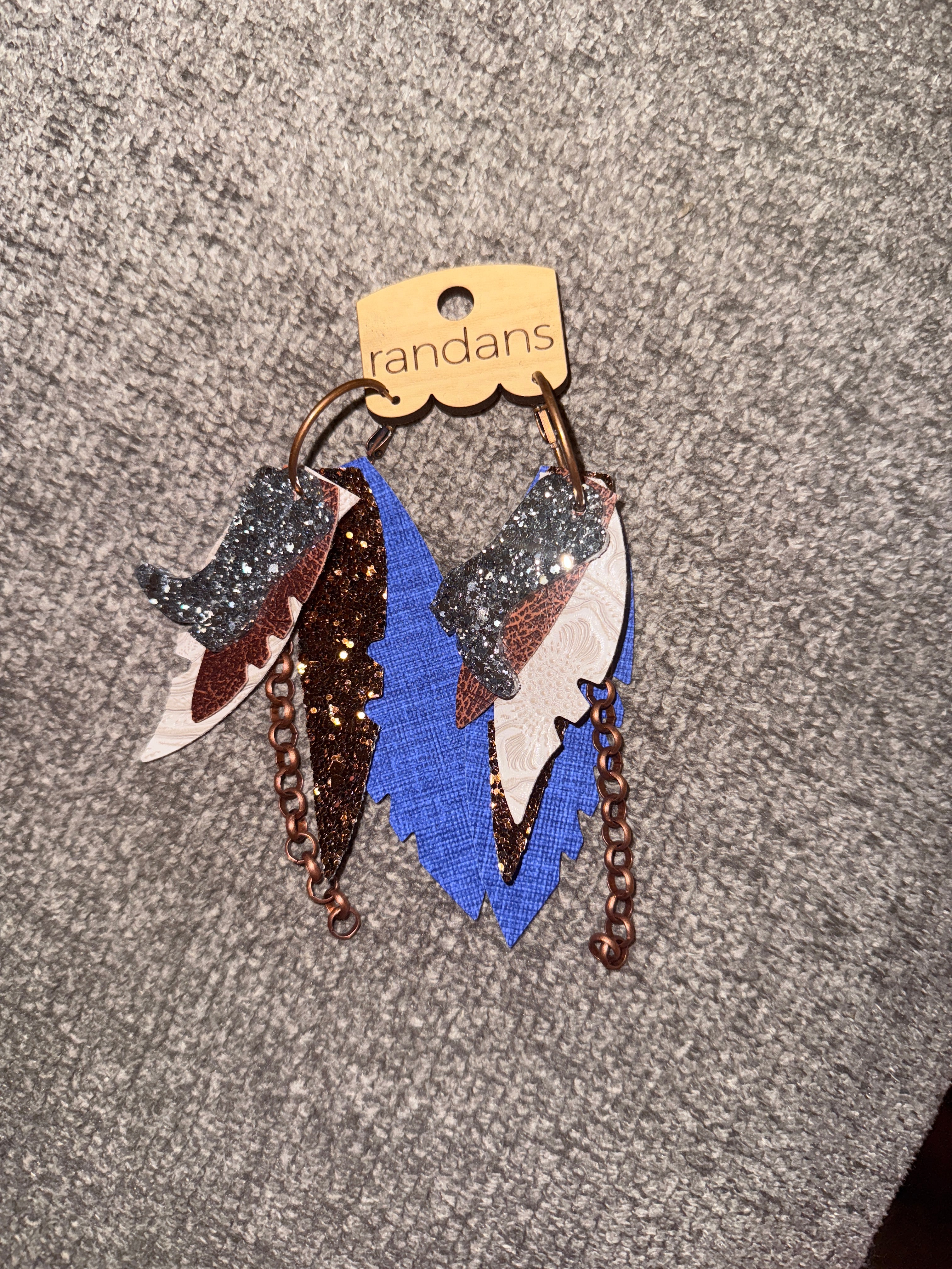 Step out in sparkle with our Blue Rodeo Boot Earrings! These western-inspired beauties feature layers of royal blue, brown glitter, and white embossed textures â topped with silver glitter cowboy boots for that extra touch of rodeo glam. The copper chain accents add just the right amount of movement, making these a must-have for concert nights, NFR season, or any time you want to show off your western flair with a little sparkle.
