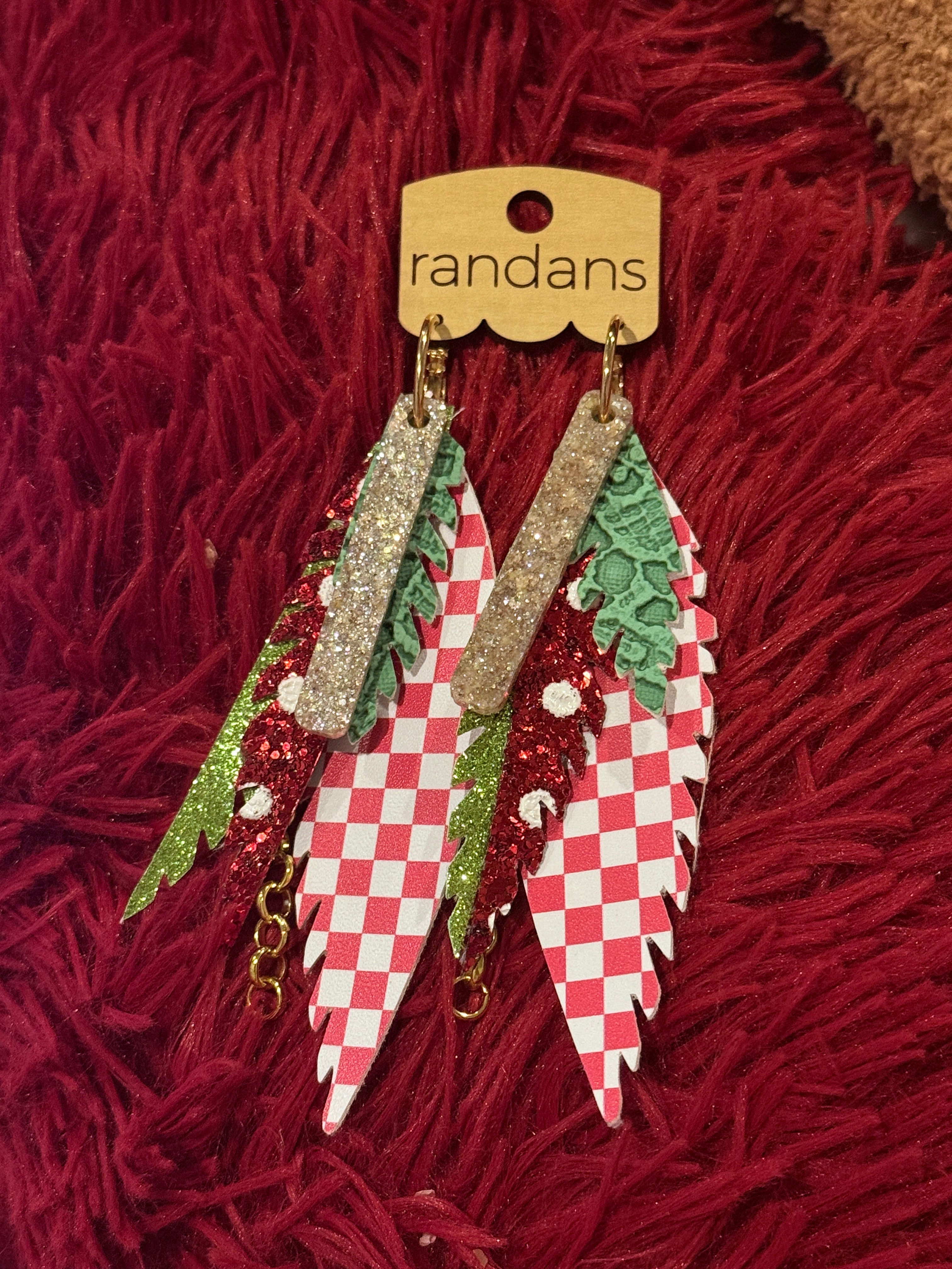 Add a playful pop of holiday cheer with our Christmas Picnic Glitter Earrings! These whimsical earrings feature layers of red-and-white checkered print, glittering green and red accents, and sparkly gold bars for that perfect festive shimmer. Finished with gold chain details and textured faux leather, they’re the ultimate statement piece for spreading Christmas joy in style.