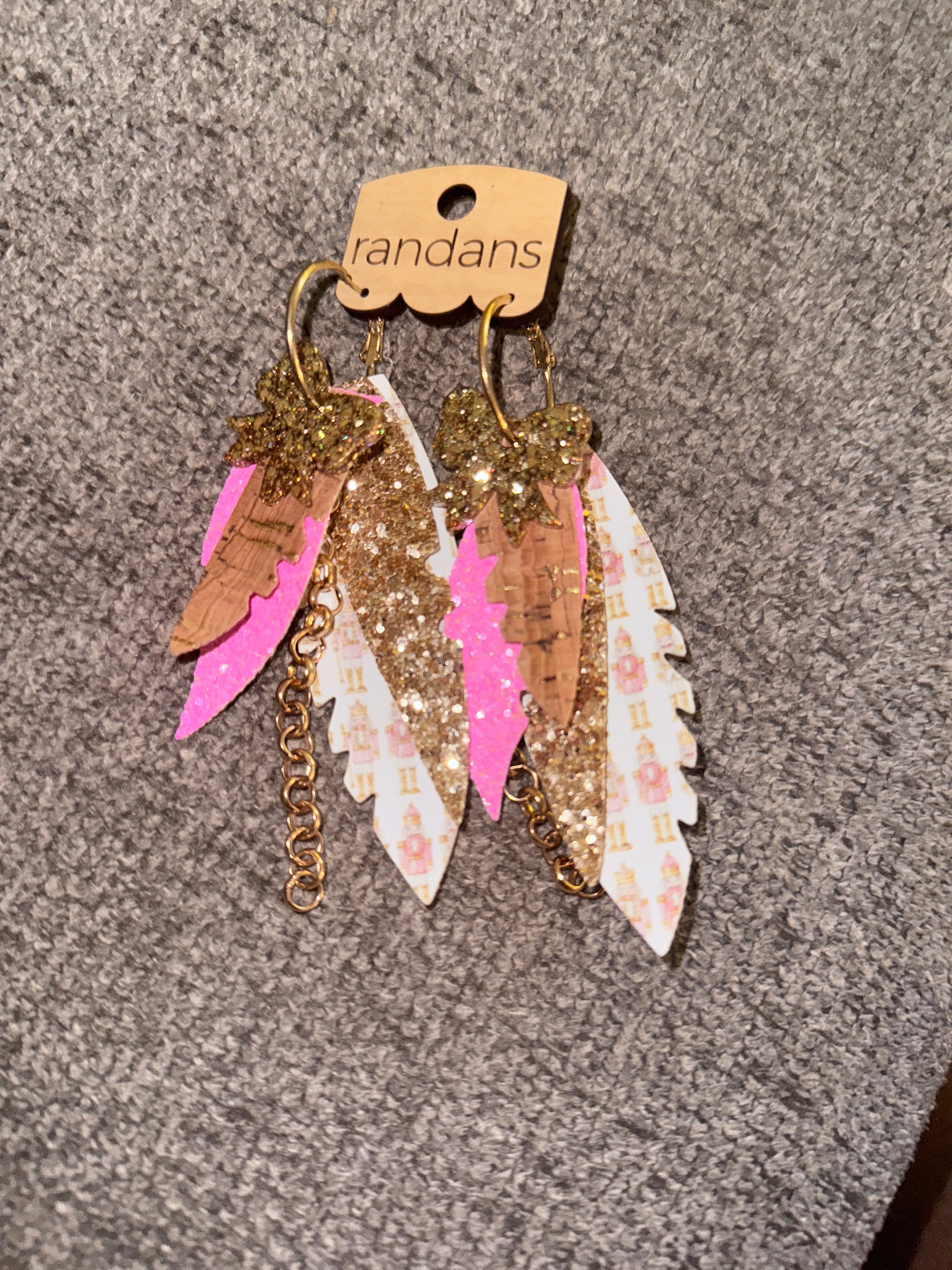 Step into the magic of the season with our Nutcracker Dreams Layered Earrings! These sparkling showstoppers feature gold glitter, soft cork tones, and pops of pink â all layered with the sweetest nutcracker print. Finished with glittery gold bows and delicate gold chain details, theyâre the perfect blend of whimsy and glam for every holiday celebration.