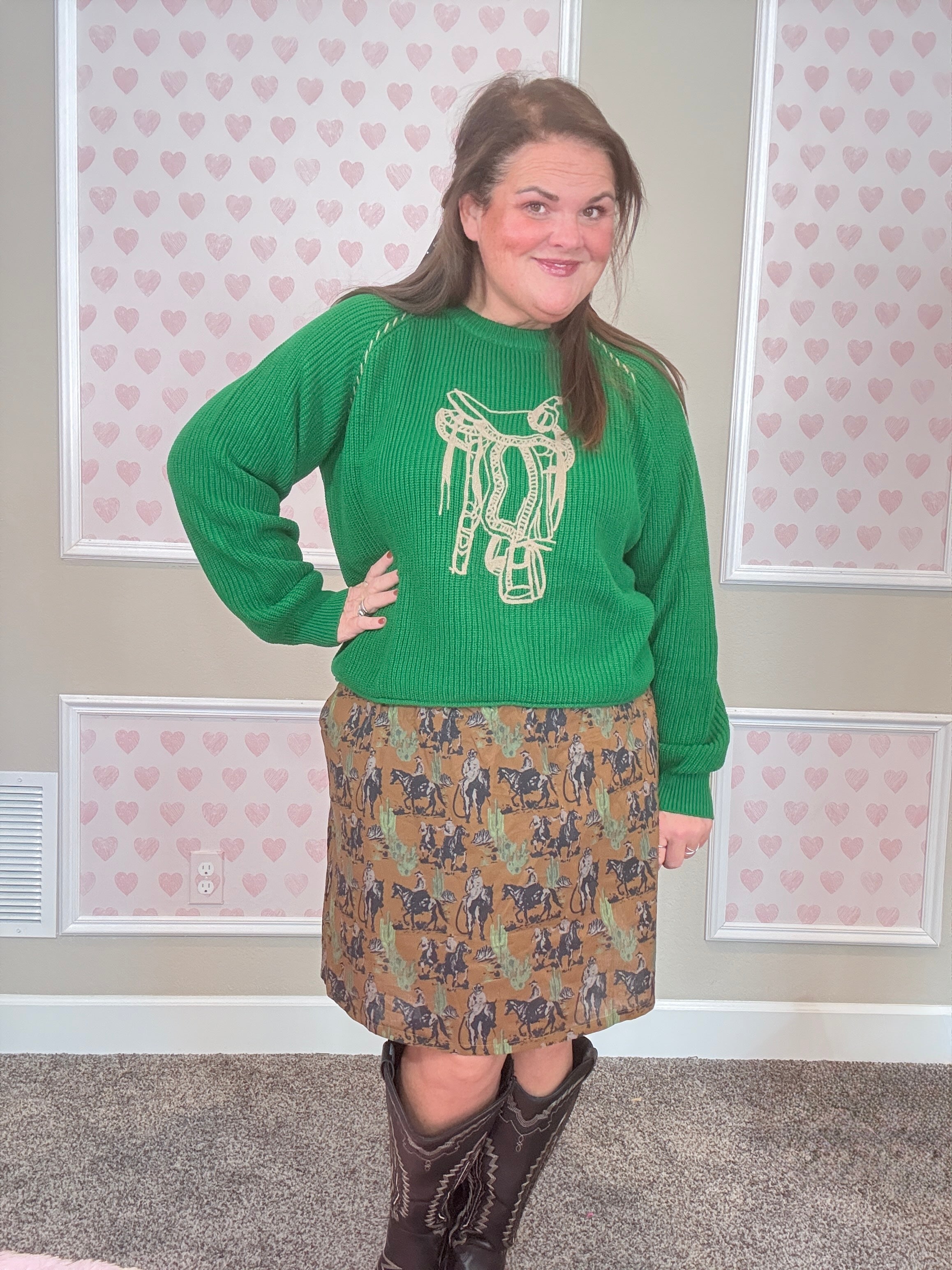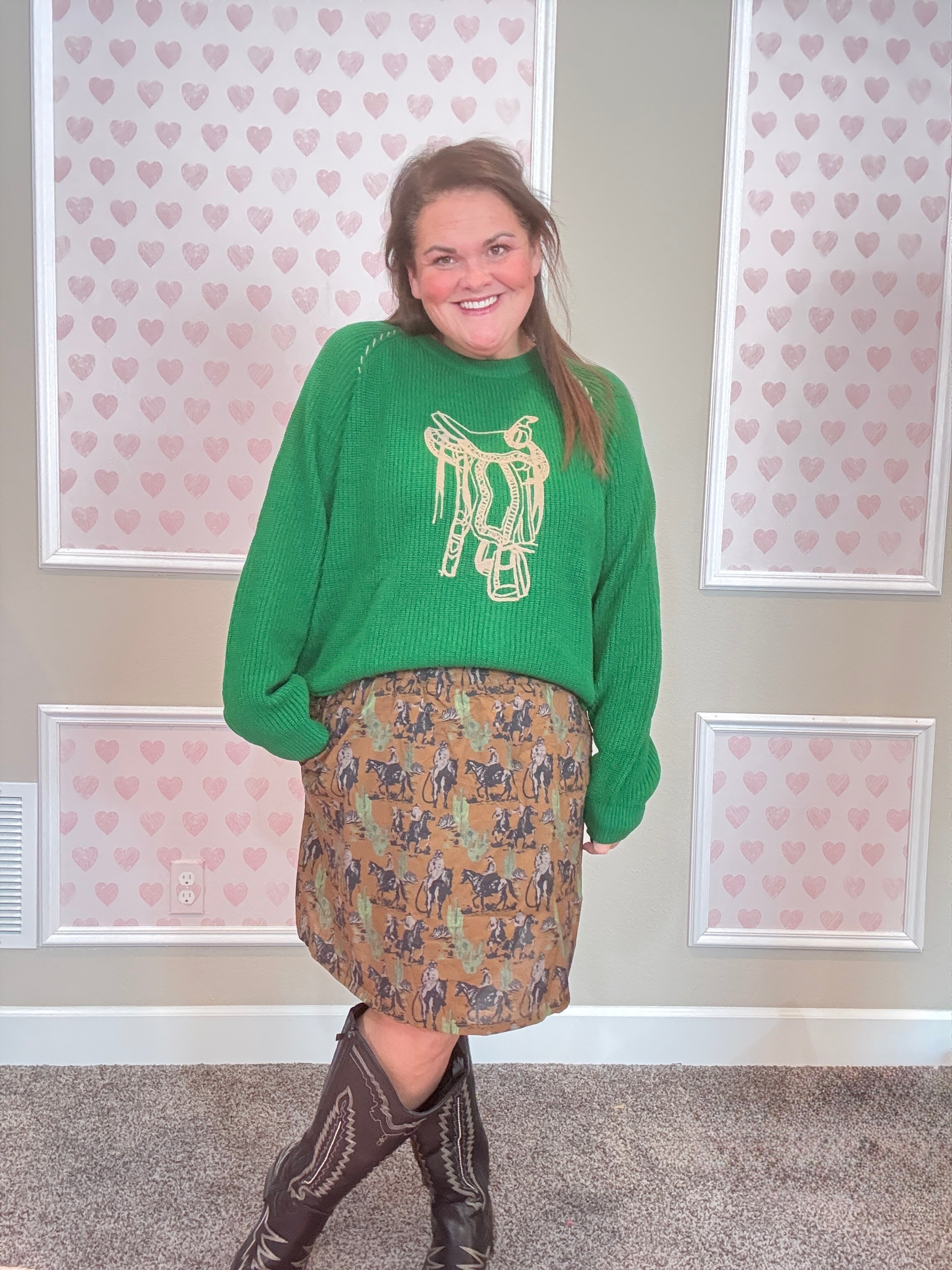 Pair with the Saddle Straps Green Sweater and cowboy boots for the ultimate chic mom-approved fall look