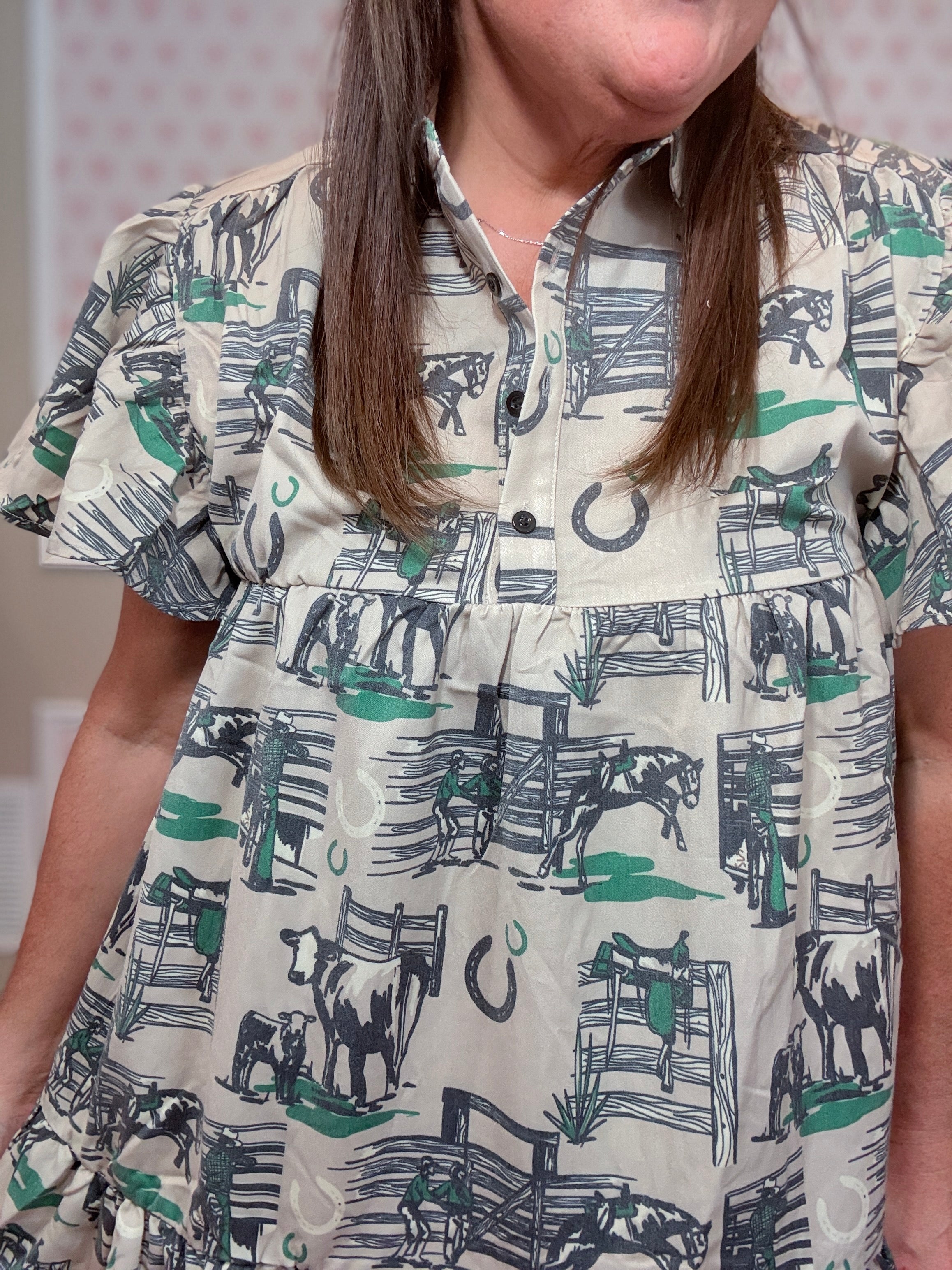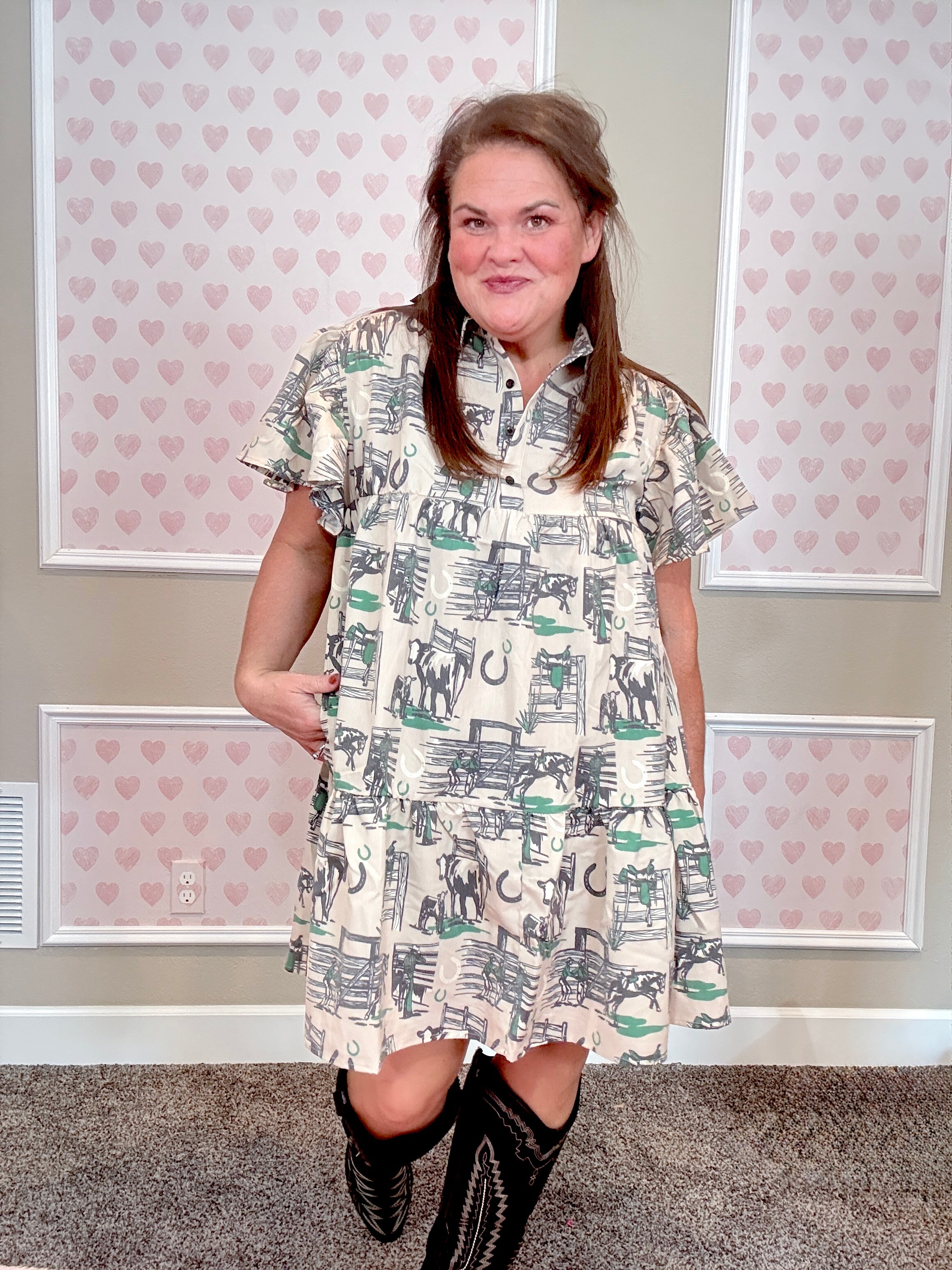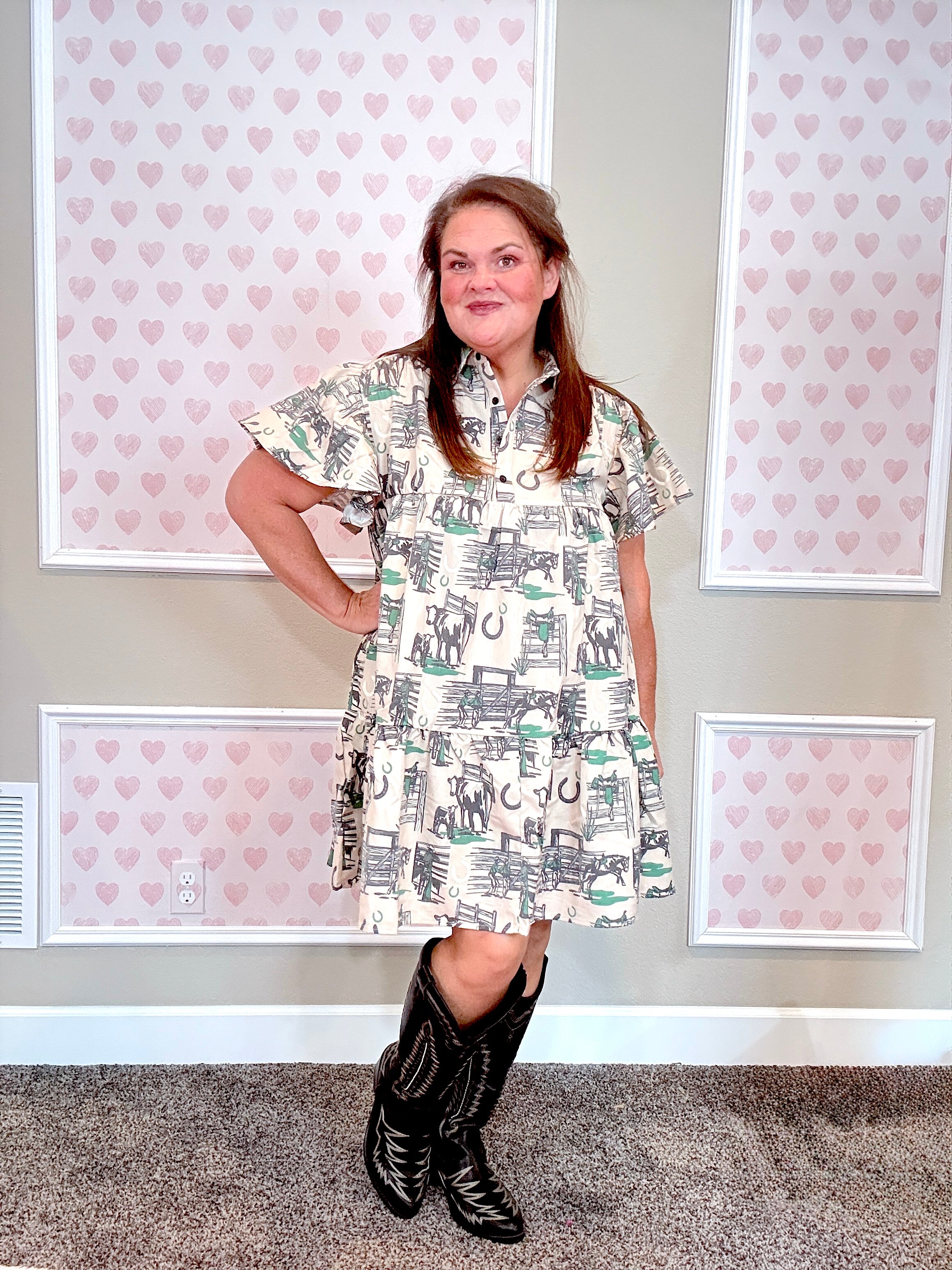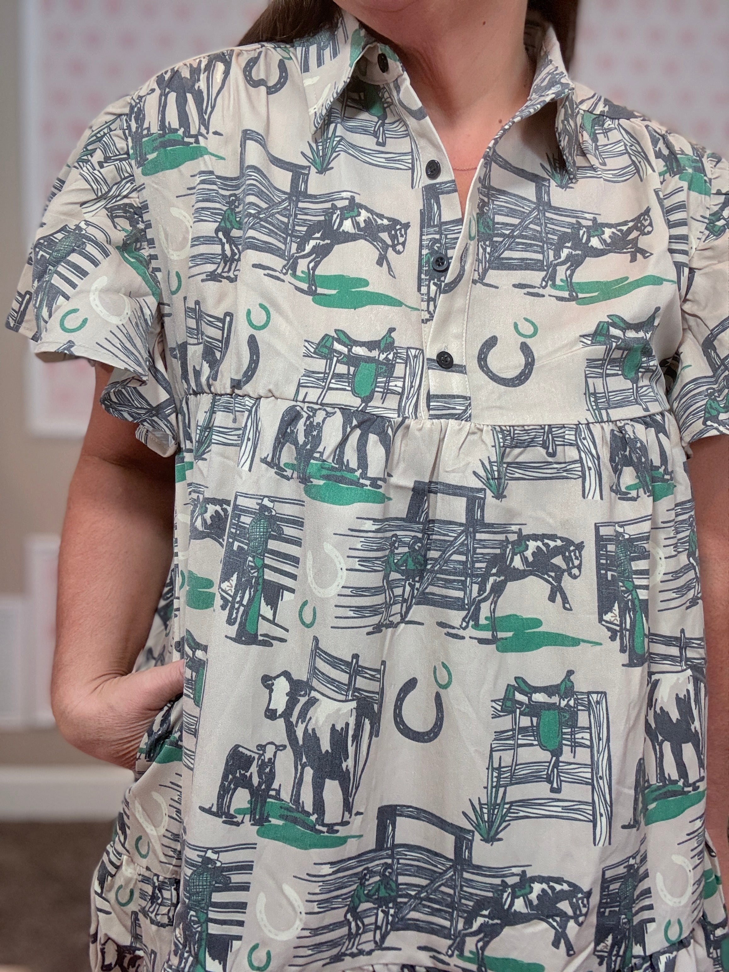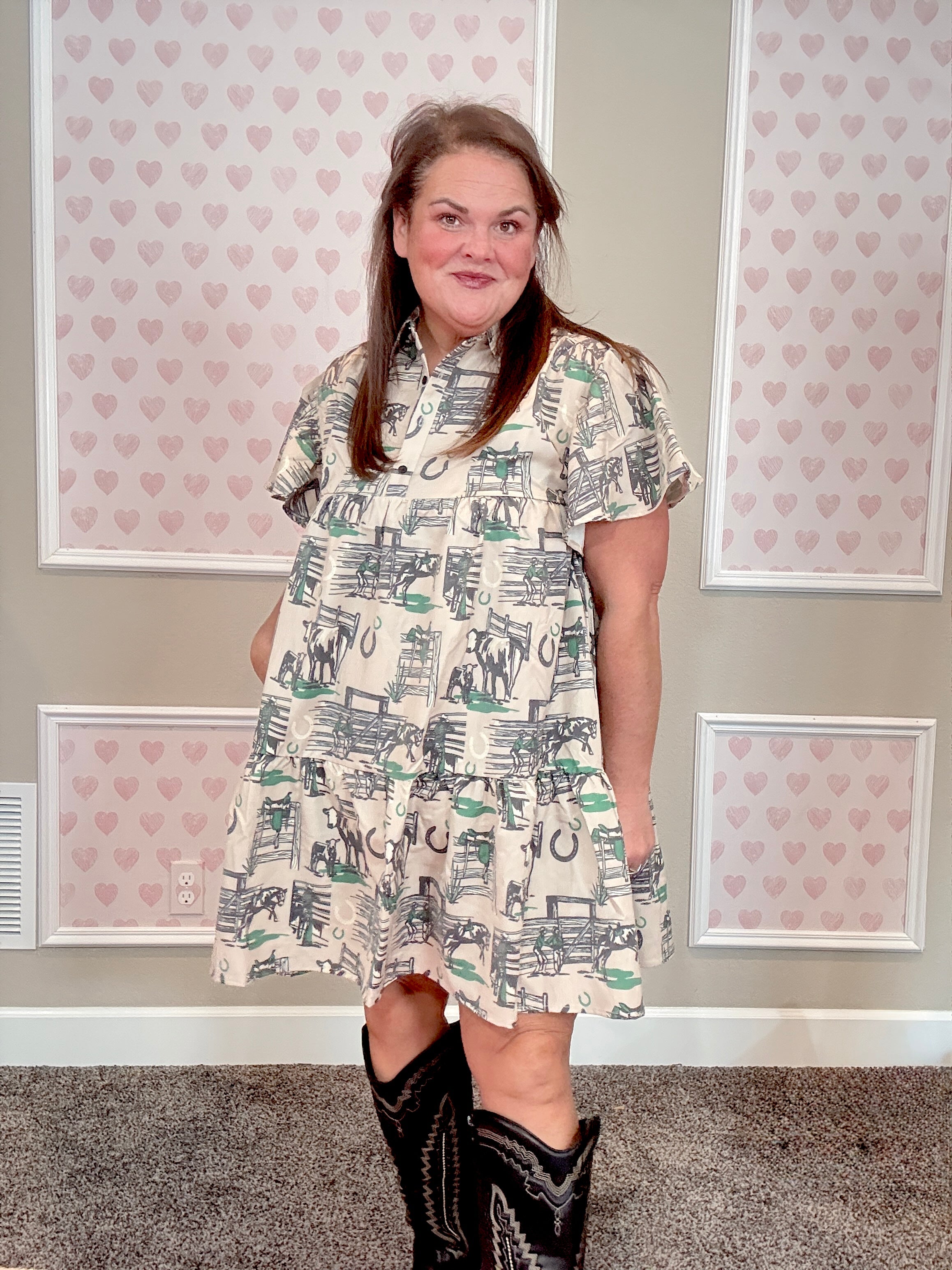 Bet you didn’t see green coming in our fall color palette 👀 (unless you got the inside scoop at market)! This dress is a whole vibe—the vintage western-inspired print is EVERYTHING.