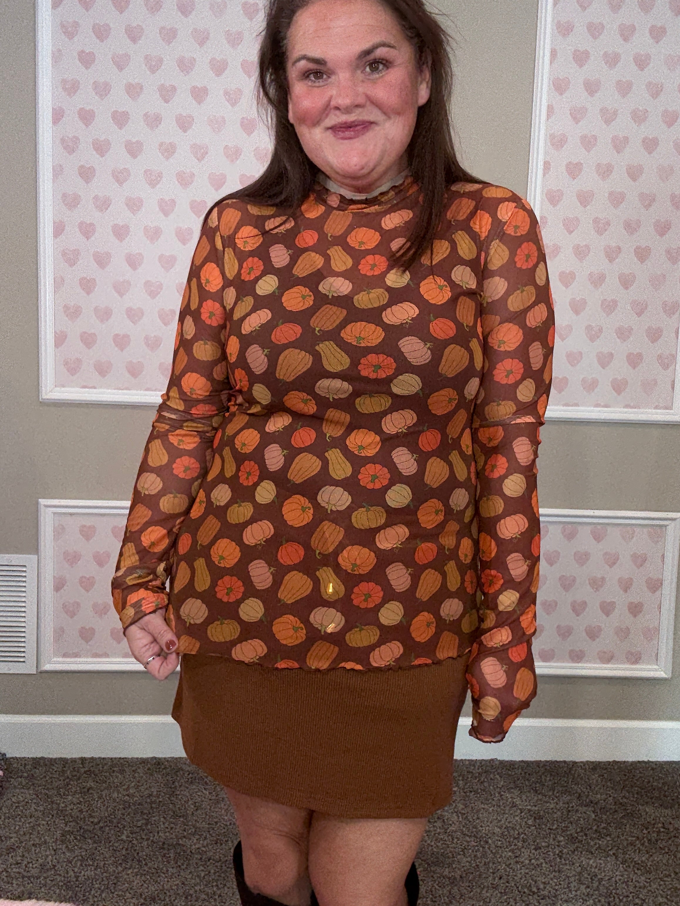 Get festive and fashionable with our Keigan Mesh Top – Pumpkin Perfection! This sheer mesh long sleeve features a playful pumpkin print that adds the perfect pop of fall fun to any outfit. With lettuce hems, a mock neckline, and ultra-stretchy fabric, it’s the ideal piece to layer under tees, cardigans, or sweaters all season long.