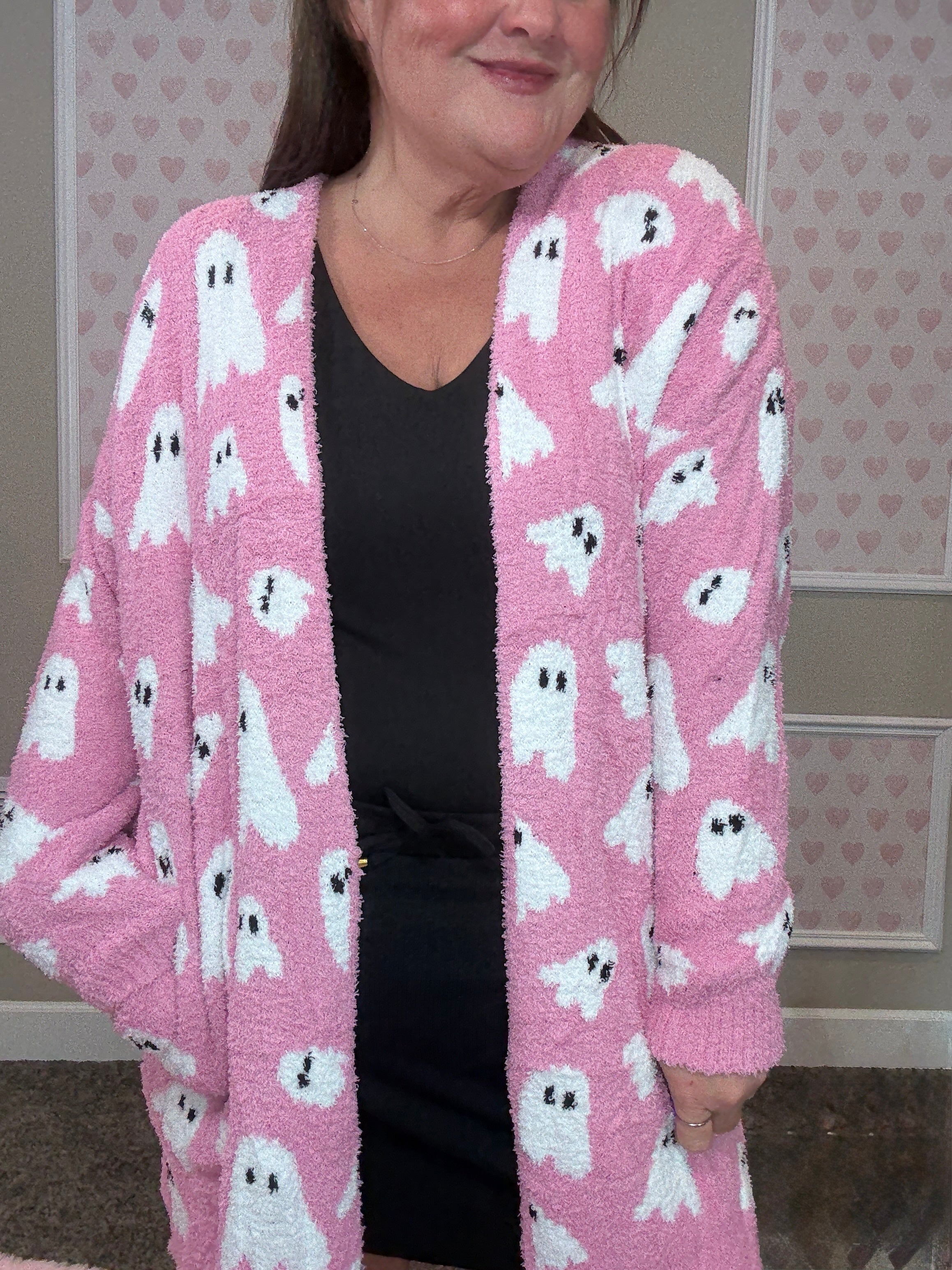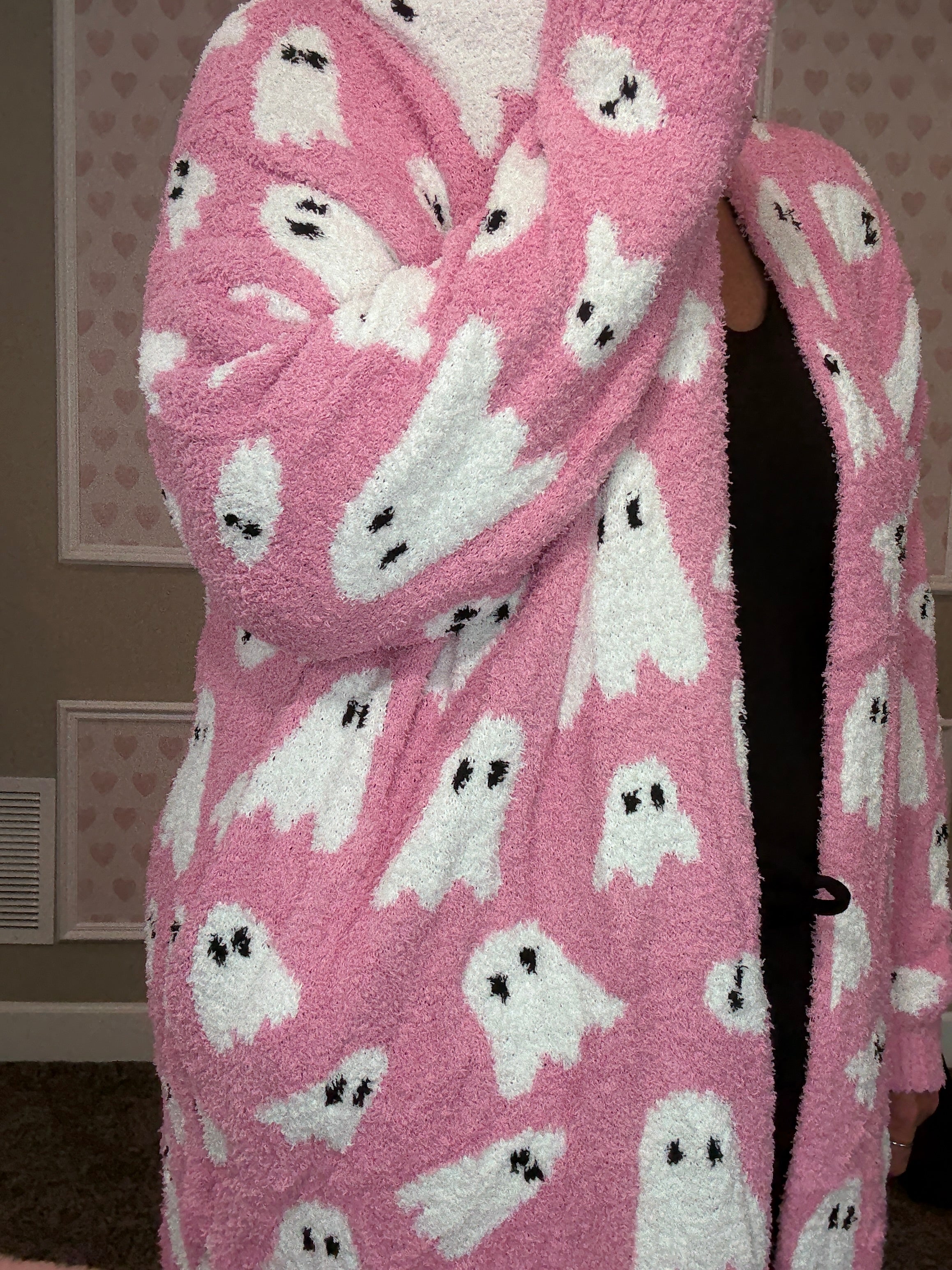 Looking for spooky season style with a girly twist? Our Pink Ghost Cloud Cardigan is everything youâve been waiting for! Made with the softest, stretchiest âcloudâ fabric (think Barefoot Dreams but even cozier), this cardigan wraps you in all-day comfort while serving the sweetest ghost print. With side pockets and a reversible design, itâs as functional as it is fun.