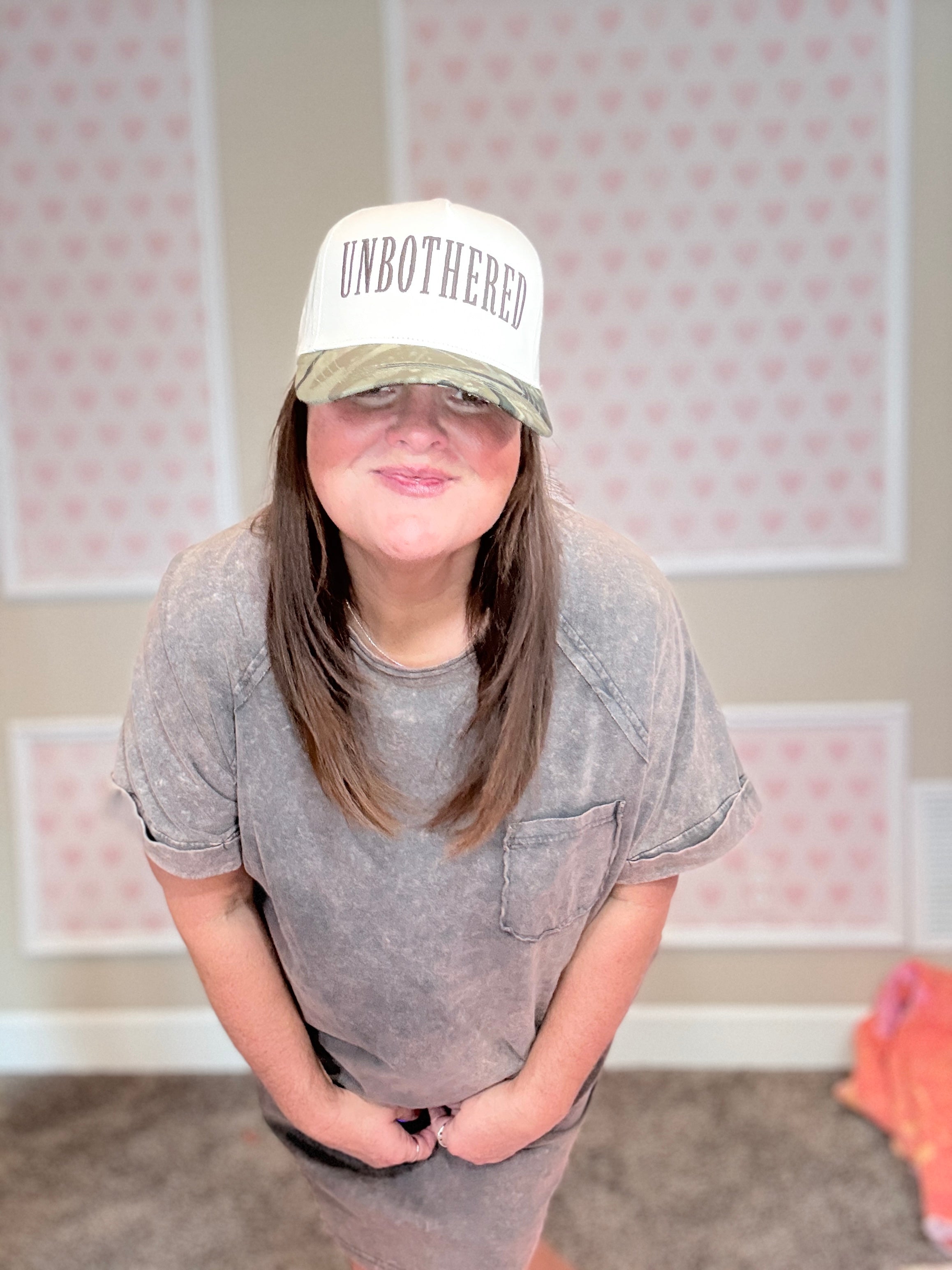Top off your look with a little attitude in the Unbothered Hat! Featuring a cream crown with bold black lettering and a camo-print bill, this cap blends casual style with just the right amount of edge. Adjustable in the back for the perfect fit, it’s the ultimate accessory for busy days, casual outings, or whenever you want to rock that “unbothered” vibe.
