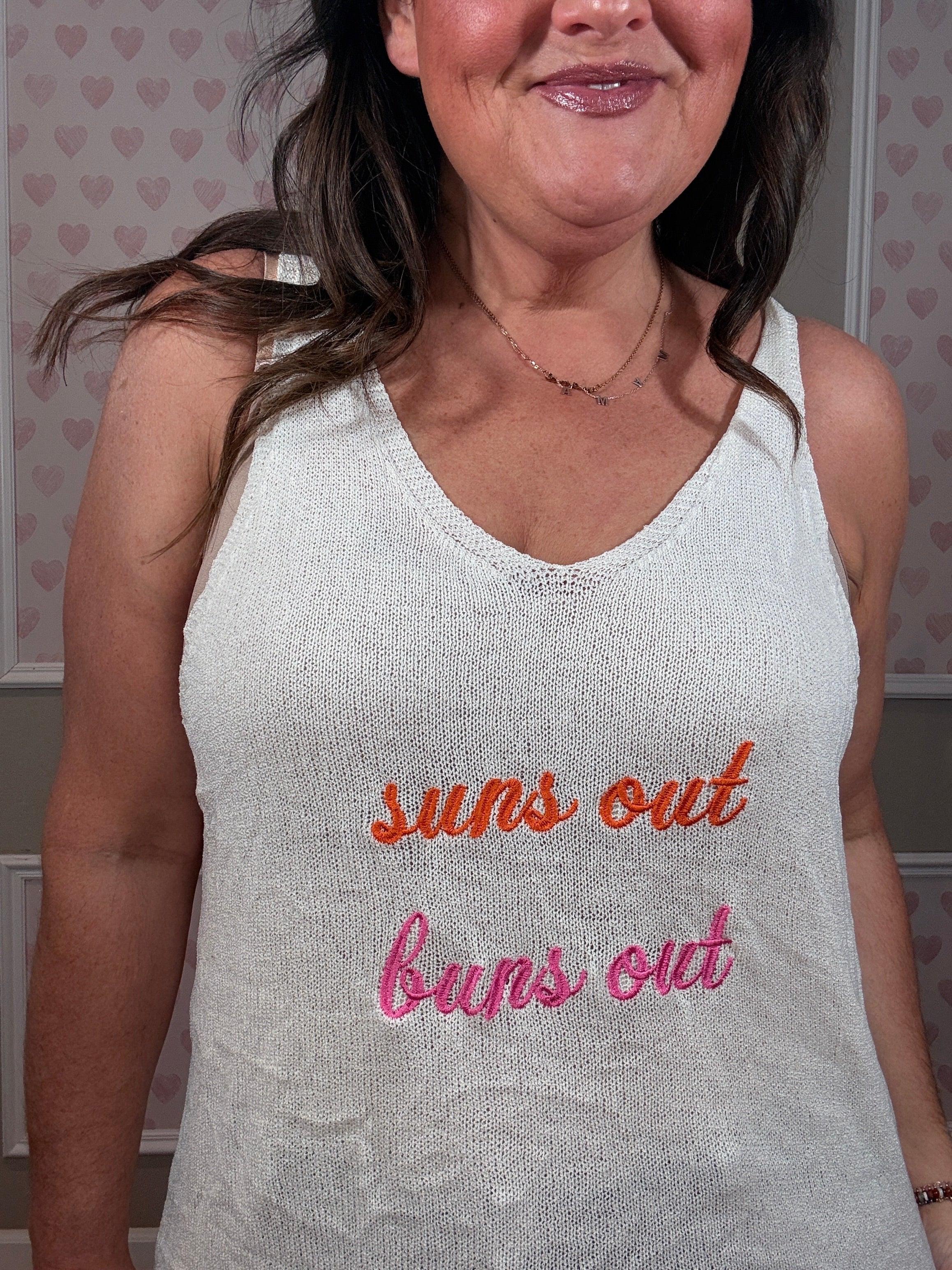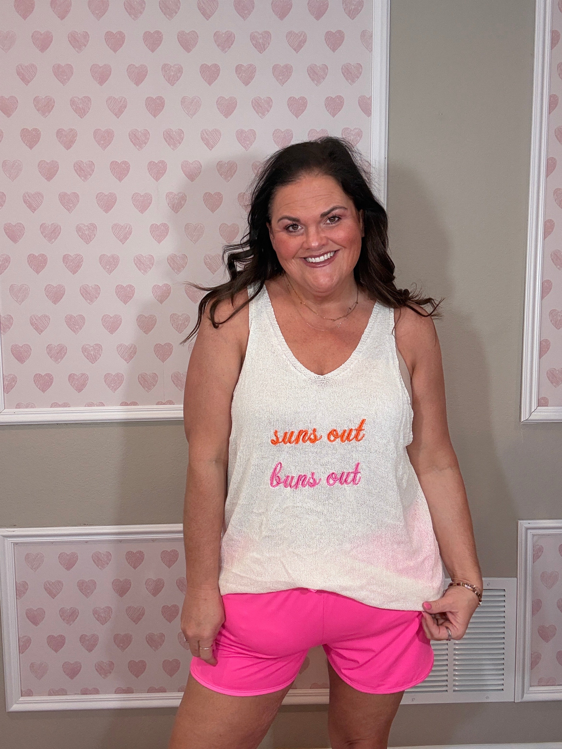The bold “Suns Out, Buns Out” embroidery in bright pink and orange adds a playful pop that feels right at home with summer fashion trends.