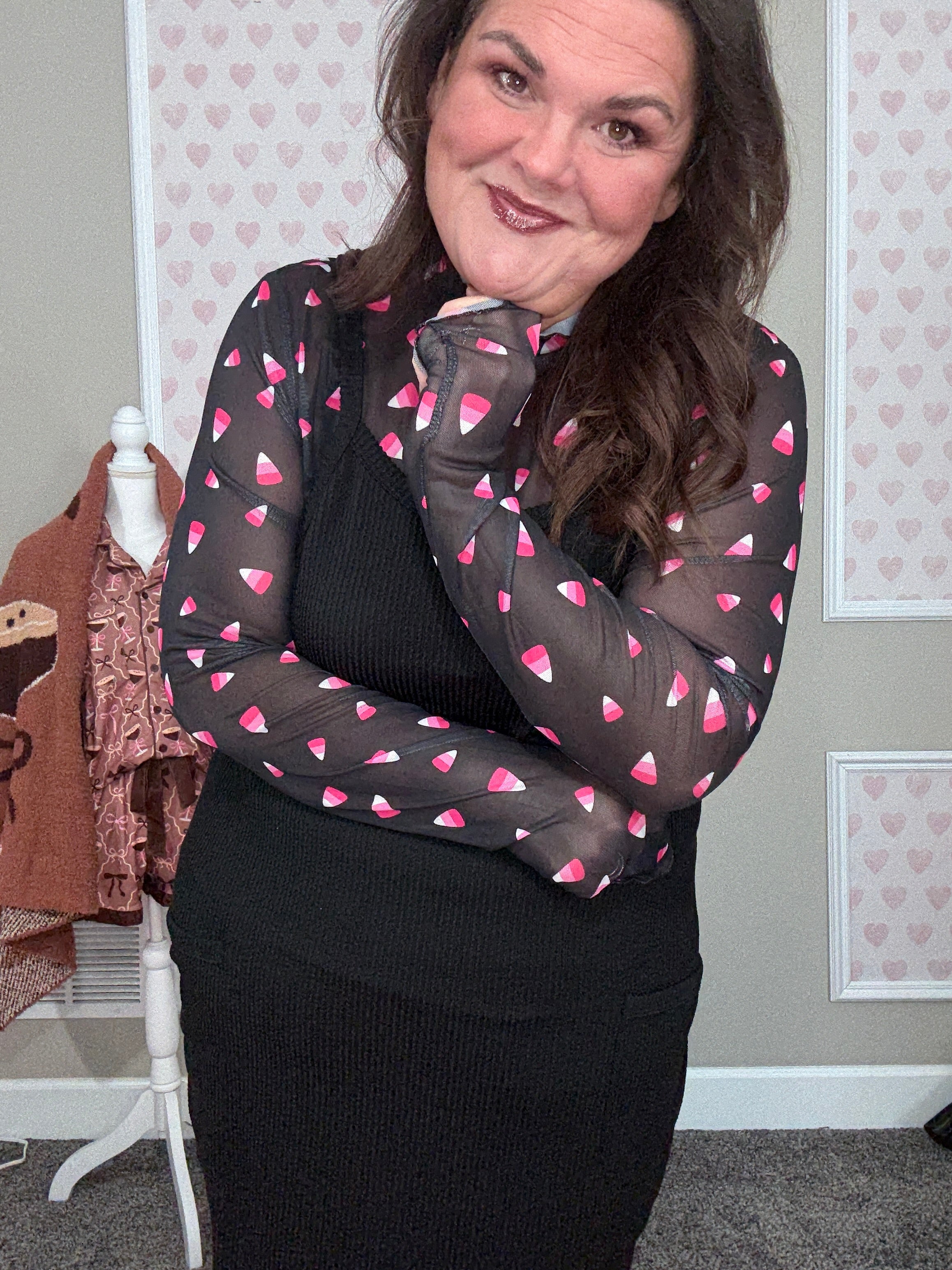 Sweeten up spooky season with our Candy Corn Mesh Top! Featuring the cutest pink candy corn print, this sheer mesh layer adds a fun and festive twist to your fall wardrobe. Designed with feminine lettuce hems and a chic mock neckline, it’s lightweight, stretchy, and the perfect piece to style under or over your favorite outfits.
