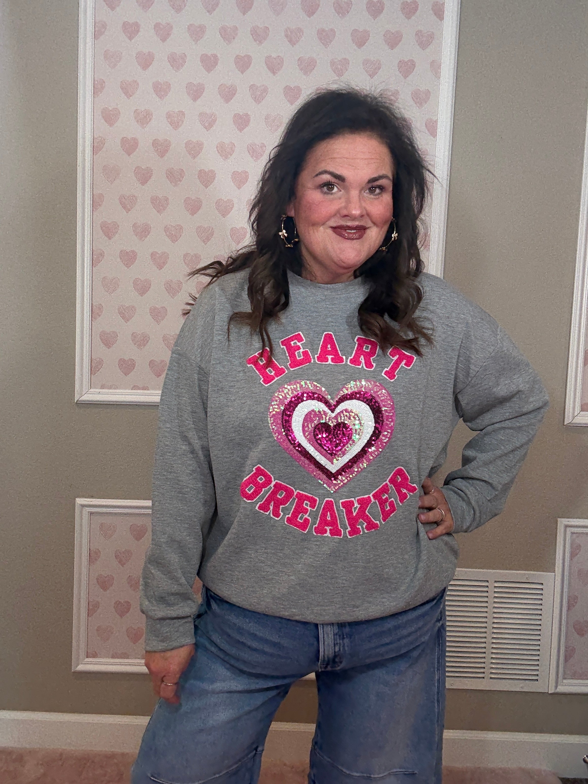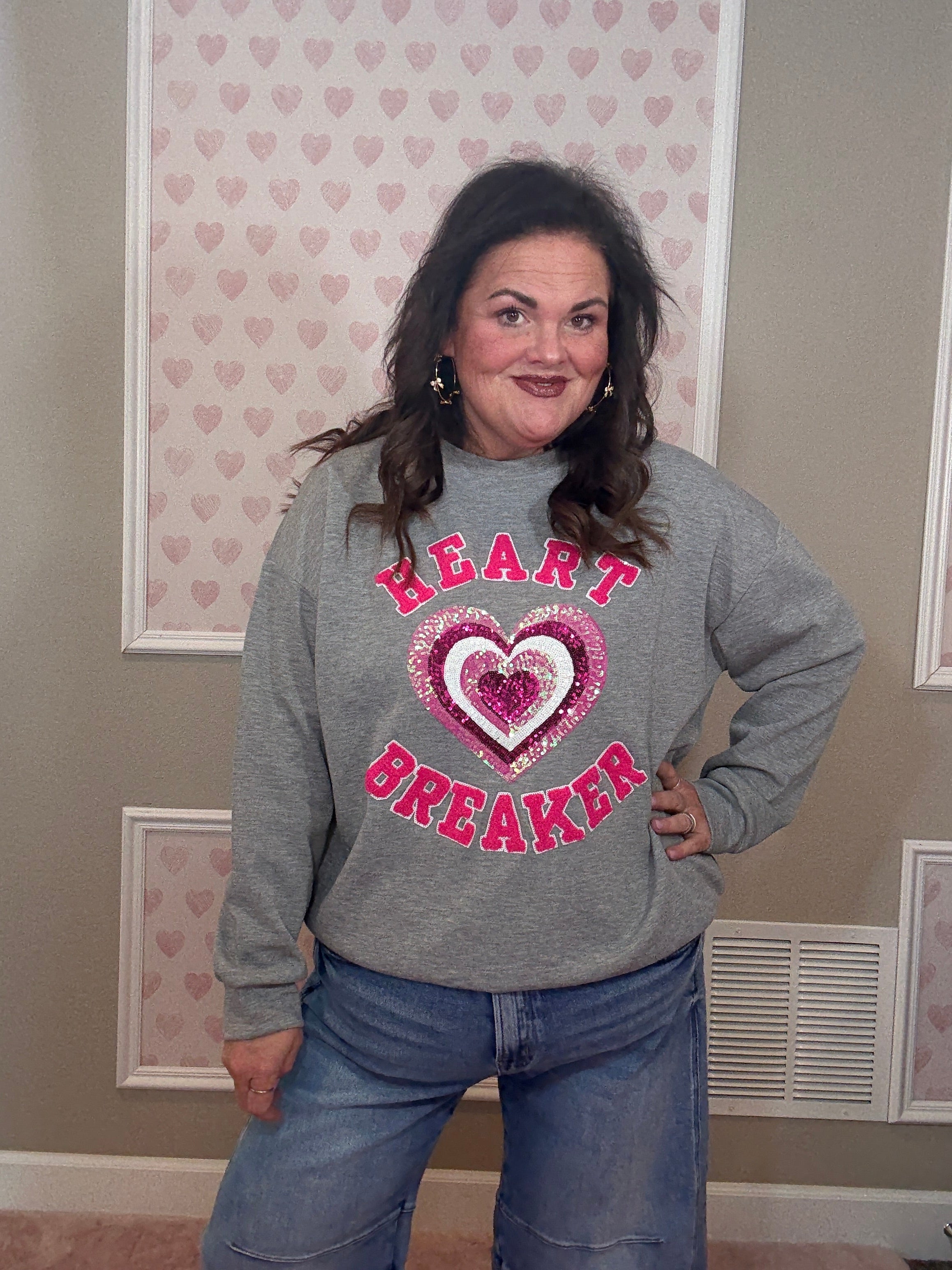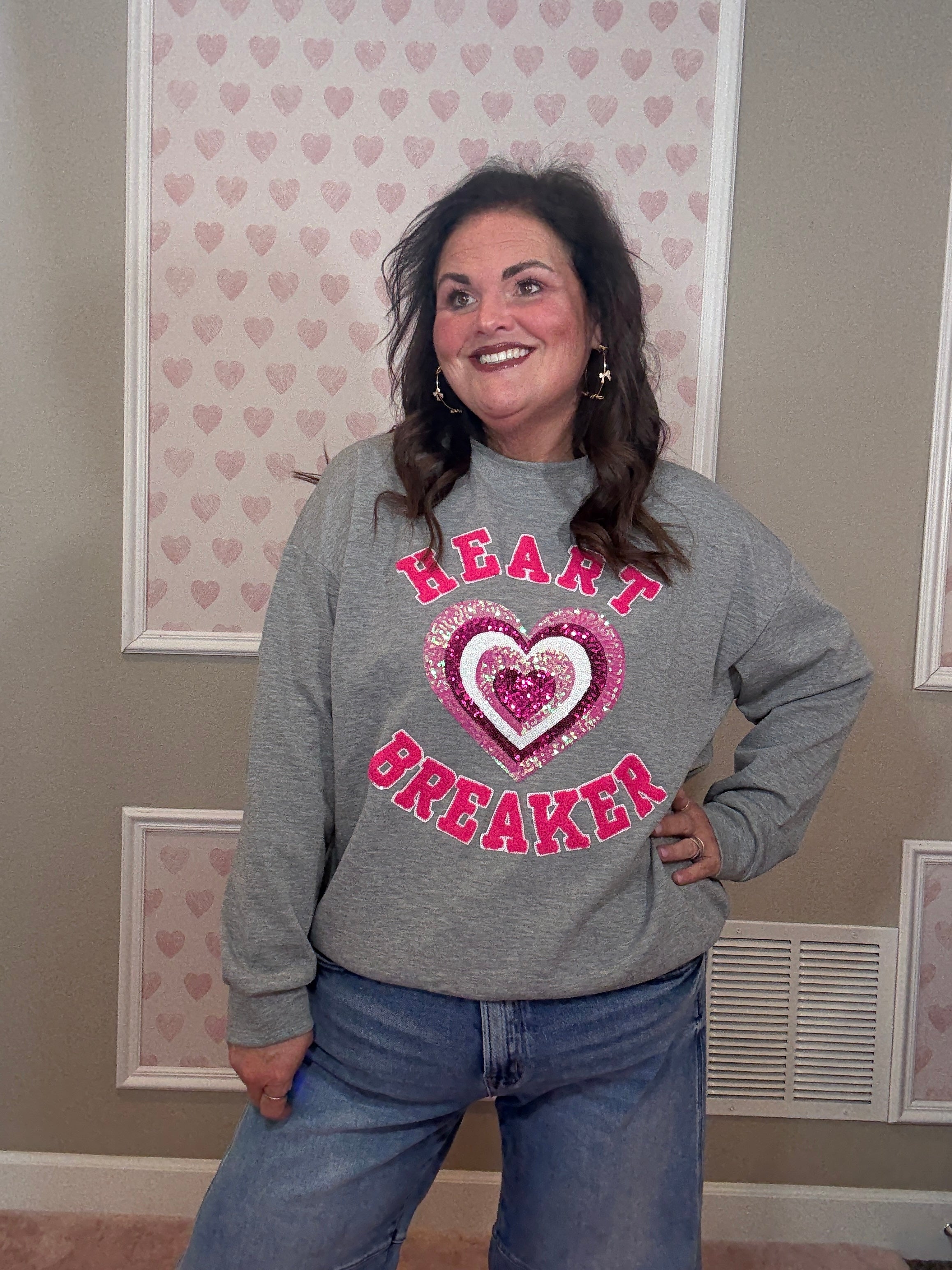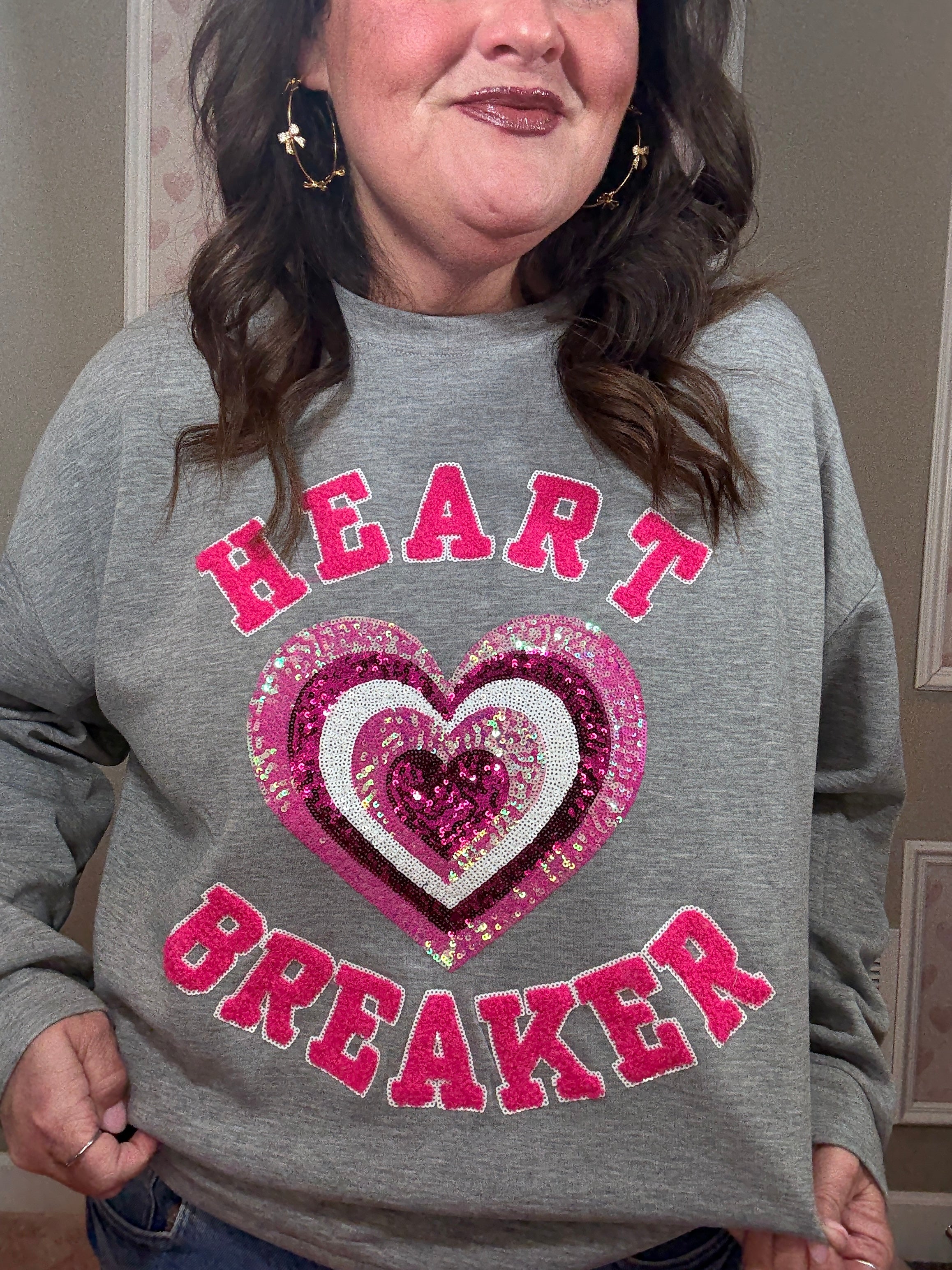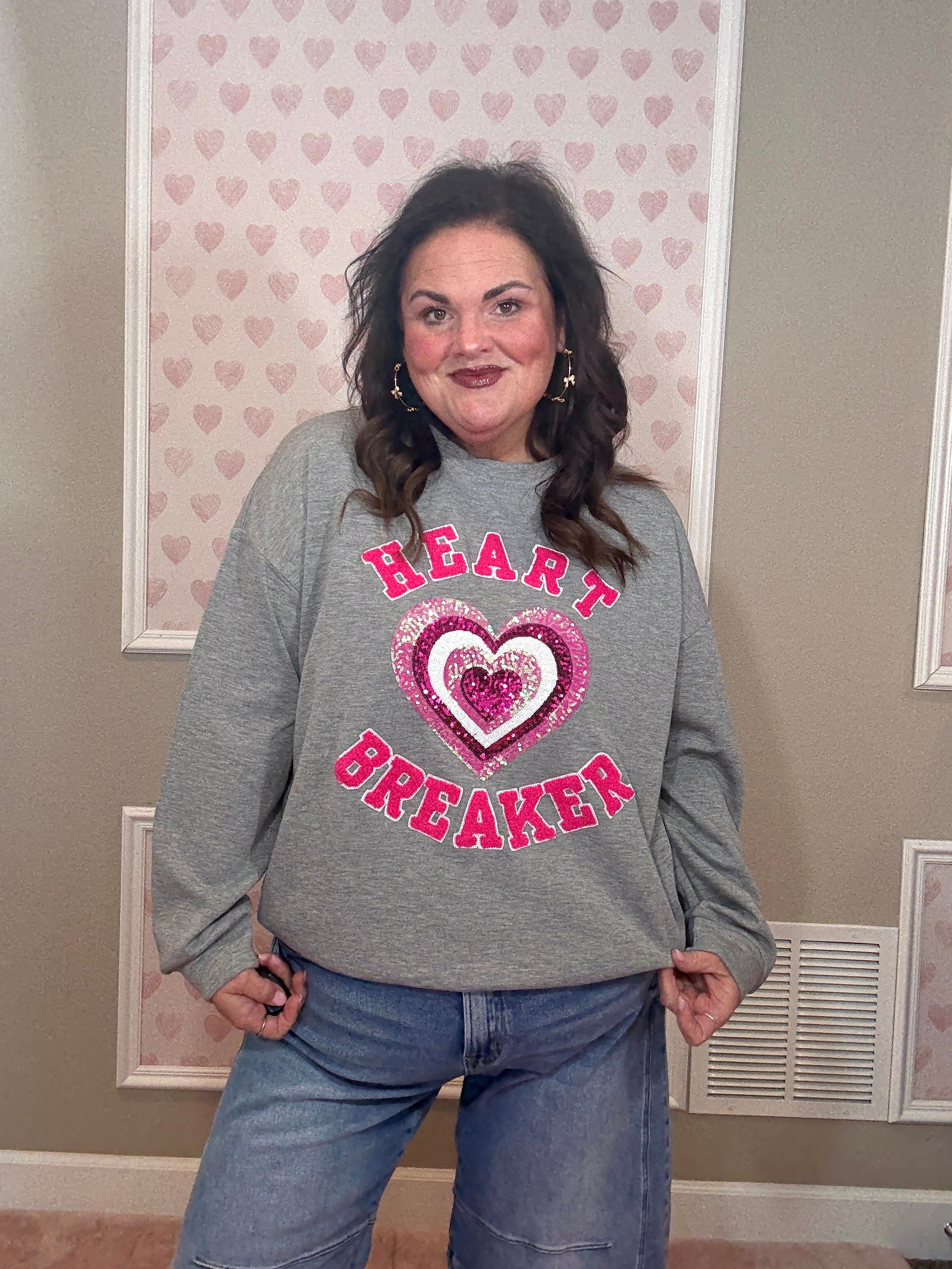 Made from a soft, luxe-feel fabric with stretch, this pullover is comfortable without feeling sloppy. The chenille “heart breaker” patches and sequin heart add texture and shine, making it feel special while still easy to wear.
